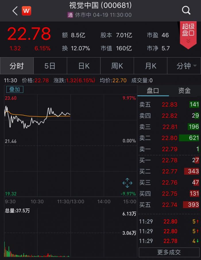 4月19日,视觉中国开盘即涨7.04%,随后涨幅虽有所收窄,但截至午间收盘时,视觉中国仍上涨超6.15%。